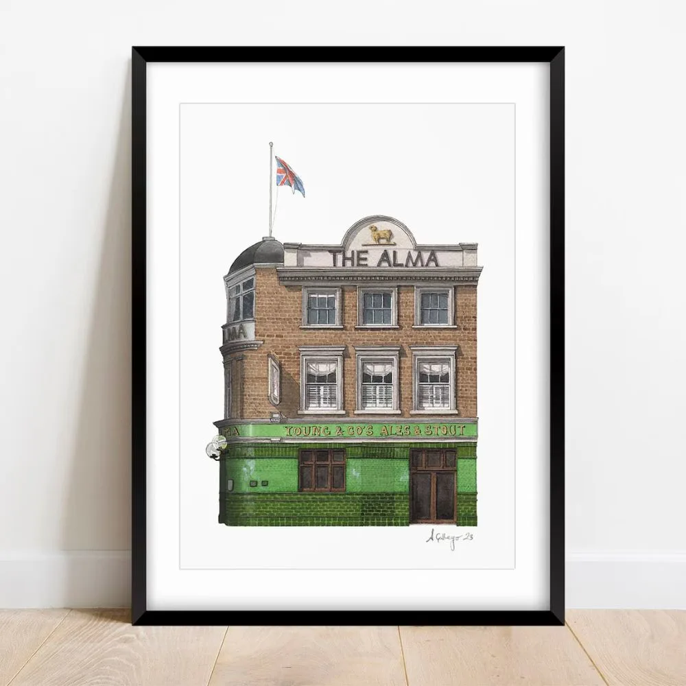 This soft and detailed giclée print of The Alma pub in Wandsworth Town was hand-painted in watercolour by London illustrator Ana Gallego. Printed on textured cold-pressed watercolour paper, it’s a charming tribute to one of SW18’s most loved local landmarks.