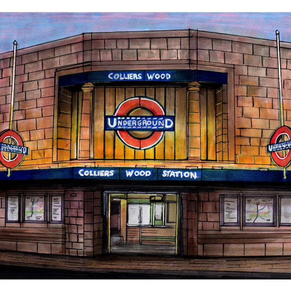 This hand-drawn Pro Marker and ink print captures the classic architecture of Colliers Wood Underground Station in Merton. A Northern Line favourite, this piece is perfect for locals, commuters, or anyone who loves the character of South London’s transport heritage.