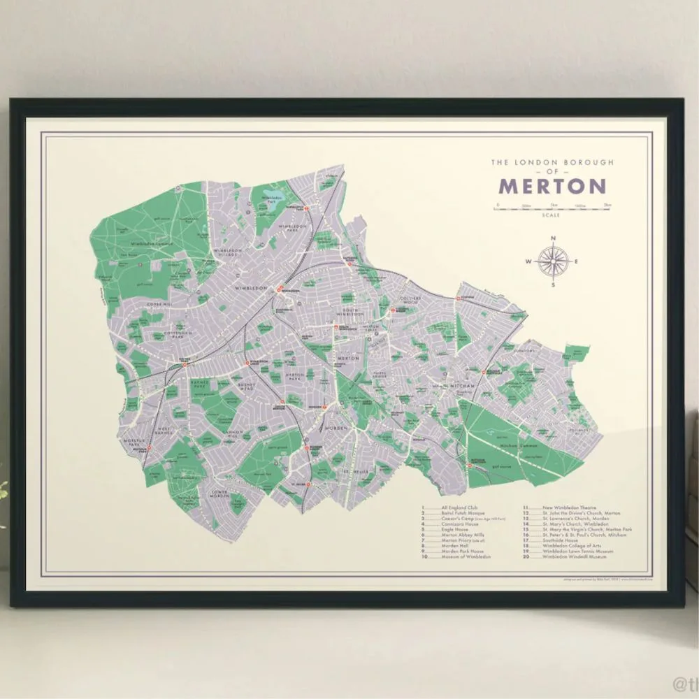 Designed in a colourful mid-century style, this retro map of Merton features all the borough’s districts, rail and Tube stations, and local landmarks. Printed on archival paper and signed by the artist, it’s a detailed and stylish celebration of the borough—from Wimbledon Village to Mitcham and beyond.