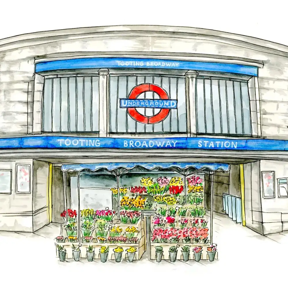 This delicate watercolour by local artist Lottie Alice Handley captures the charm of Tooting Broadway with soft tones and layered texture. A lovely keepsake for anyone with a connection to this vibrant corner of South London.