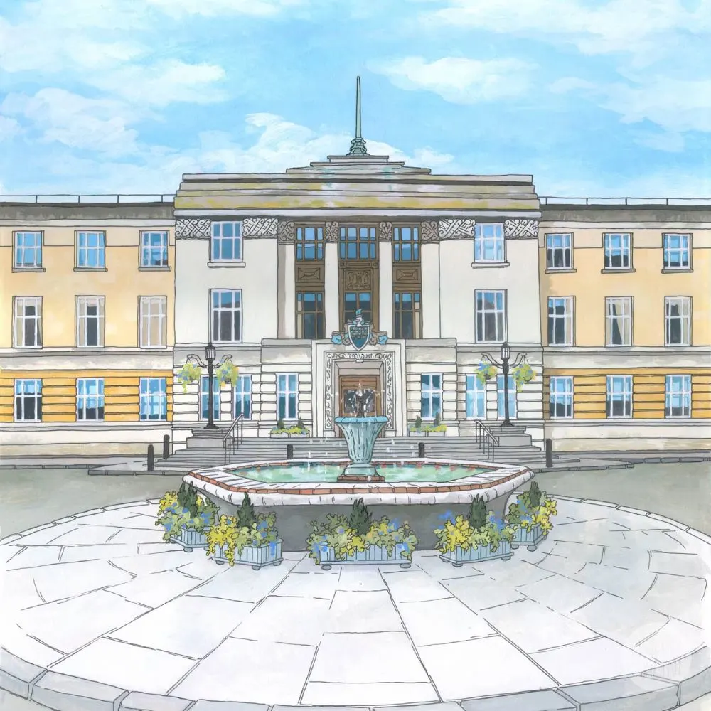 A colourful signed print of Wandsworth Town Hall by artist Jonathan Chapman. Limited to just 25 copies, this detailed 20x20cm illustration captures the iconic wedding venue with its grand façade and fountain. Printed on thick 300gsm paper and beautifully wrapped for gifting or display.