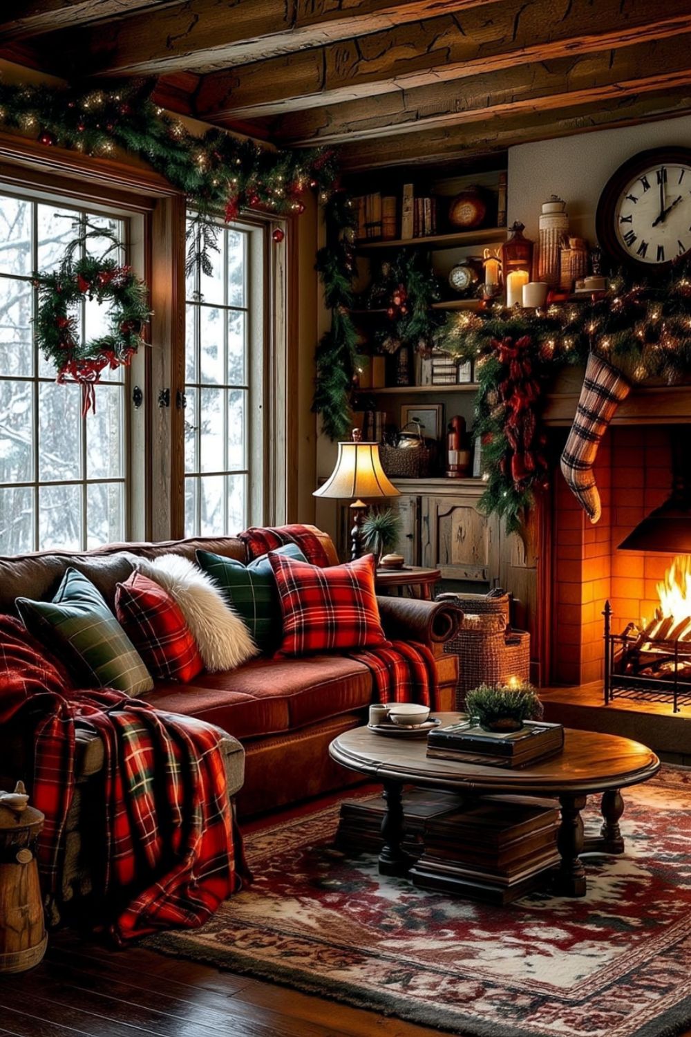 Layer tartan throws, plaid pillows, and lush garlands with twinkling lights for a warm, nostalgic holiday atmosphere.