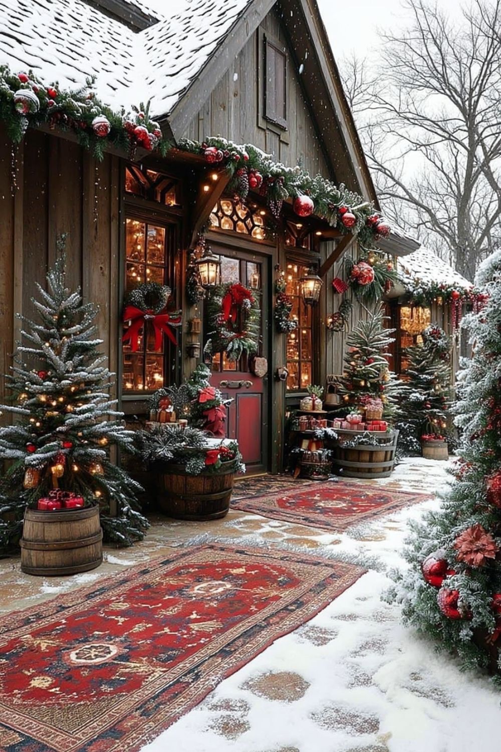 Decorate your entryway with snowy evergreens in barrels, red bows, and layered oriental rugs for a festive old-world welcome.